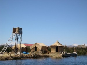 And here’s Mike in another tower. Since the towers are built on the springy island reeds, the ladders are a bit scary to climb. I knew that if I fell I would be landing on a soft pile of reeds though, so I didn’t worry about it too much. If I’m remembering correctly, I think the little teepee in the foreground is where the food gets cooked.