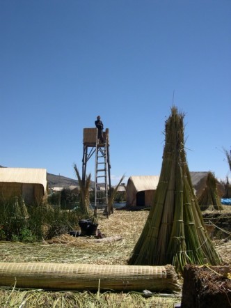 And here’s Mike in another tower. Since the towers are built on the springy island reeds, the ladders are a bit scary to climb. I knew that if I fell I would be landing on a soft pile of reeds though, so I didn’t worry about it too much. If I’m remembering correctly, I think the little teepee in the foreground is where the food gets cooked.