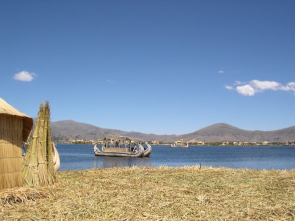 Our first stop was one of the coolest and most unique places I have ever set foot. In fact, this was evident from the very first step I took onto the island. Lake Titicaca is home to the “floating islands” of Uros. An entire chain of islands near Puno is man-made from totora reeds. The 40-some-odd islands are home to 700 or so Uros people who originally left land in order to evade enemies hundreds of years ago. Not only are the islands themselves made of totora reeds, so are the inhabitants’ houses, their boats, and many of their crafts. Stepping onto an Uros island is somewhat like stepping on a hay bale — the ground is springy yet solid, made up of millions of reeds yet cohesive. The islands are tethered to keep them from floating on over into Bolivia, so they almost have the feel of an enormous raft rather than an island. Of course, many of the Uros islands are large enough to house schools, multiple family homes, and other common community buildings.