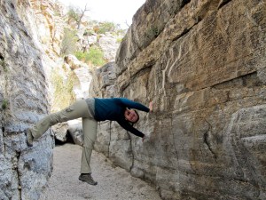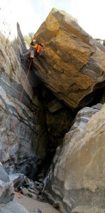 After we hiked to the Prison Camp, we started back down via the canyon. There was very little water in the canyon, but apparently it features significant waterfalls at other times of the year. There was a lot of riparian growth, so we had to bushwhack through several sections. The second half of the canyon featured some pretty nice rappels, too. Four in all. The longest rappel was approximately 70 feet and ended beneath a house-sized boulder. Although this wasn’t the most remote (we saw several climbers doing sport routes in the canyon) or epic canyon ever, we had a great day enjoying the sunshine and scenery. Plus we made it out before dark!