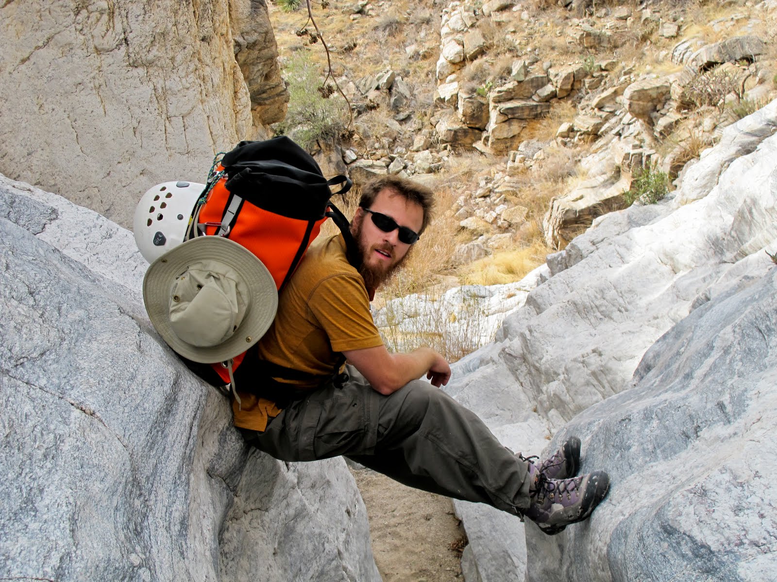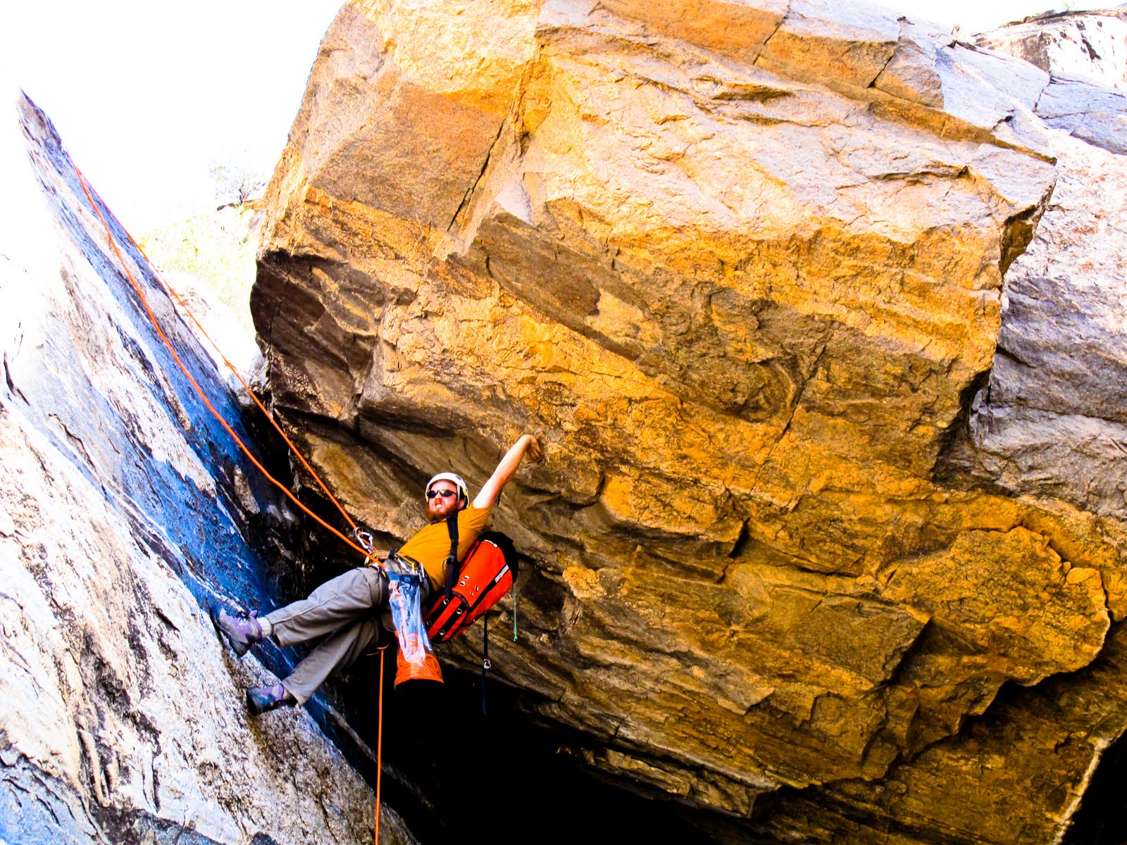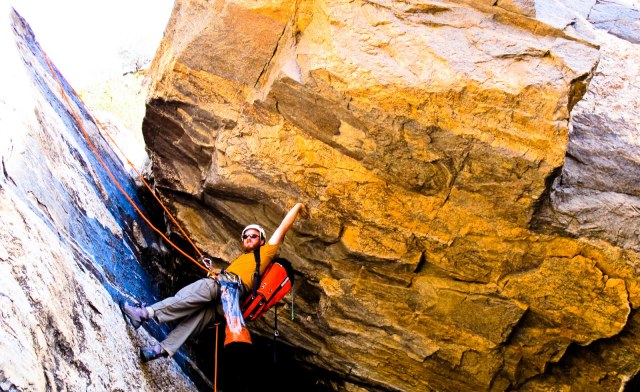 After we hiked to the Prison Camp, we started back down via the canyon. There was very little water in the canyon, but apparently it features significant waterfalls at other times of the year. There was a lot of riparian growth, so we had to bushwhack through several sections. The second half of the canyon featured some pretty nice rappels, too. Four in all. The longest rappel was approximately 70 feet and ended beneath a house-sized boulder. Although this wasn’t the most remote (we saw several climbers doing sport routes in the canyon) or epic canyon ever, we had a great day enjoying the sunshine and scenery. Plus we made it out before dark!