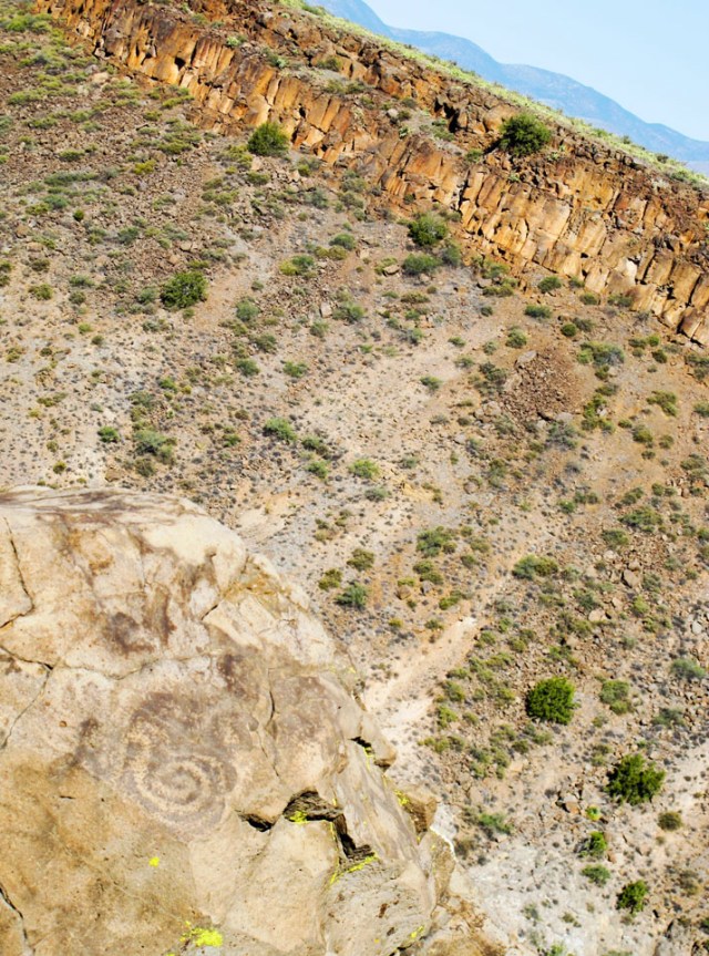 The next morning we woke up and headed cross-country through the open and fairly featureless desert toward a point on Mike’s GPS. After crossing 2 miles of desert we ended up at the top of a canyon we hadn’t even seen a hint of from our car. A lovely spiral (snake?) petroglyph and a gloriously-scented plant marked the start of our descent.