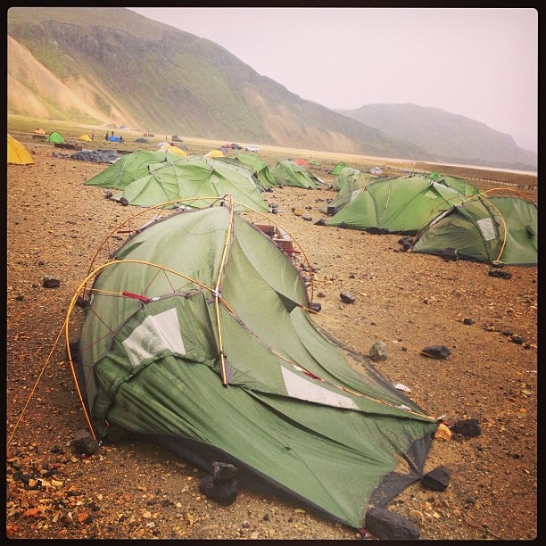 The tents are in various stages of succumbing to the elements. There are a few super structures (more like yurts) that must belong to professional outfitters and guided expeditions. These few look sturdy and trustworthy. A step below these elite giants are the tents like ours, which are clearly designed well for extreme elements. Sure, they look a little limp, wet, and wind blown, but they also look like they’re keeping out most of the dampness. They look like they can withstand another few nights of heavy winds if necessary. Next, there are the tents that are still standing . . . barely. They seem distorted, waterlogged, near collapse. I can hear fortifications going on outside right now. I talked to one man who was planning on moving his tent from the middle of a lake that formed overnight to a small grassy patch that seemed to be draining a little at least. Finally, there are the remnants of tents I see evidence of. I saw many people dragging soggy bundles crisscrossed with poles across the open areas. I saw others cramming battered tents into garbage bags. Landmannalaugar has one sleeping hut where you can pay $50 to share a bunk bed with someone, but those beds were sold out months ago.