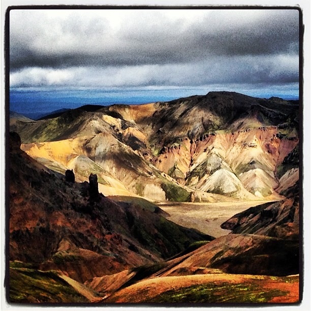 We started by hiking through moss-covered lava rocks which varied from rough-and-porous basalt to smooth-as-glass obsidian. Shortly after we started, we caught glimpses of the colorful rhyolite mountains soon to dominate the trail. Rhyolite creates beautiful mountains in the most surreal hues. The colorful, slightly rounded shapes reminded me of the Badlands a bit, though the two areas were formed very differently. The play of shadows caused by the gloomy clouds occasionally penetrated by the timid sun made these gorgeous behemoths all the more striking.
