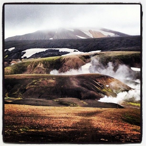 Interspersed among the rhyolite mountains were areas of geothermal activity. There were hot springs and fumaroles aplenty, engulfing the mountains in steamy otherworldliness. The smell of hard-boiled eggs that accompanies sulfur hung in the air as well.