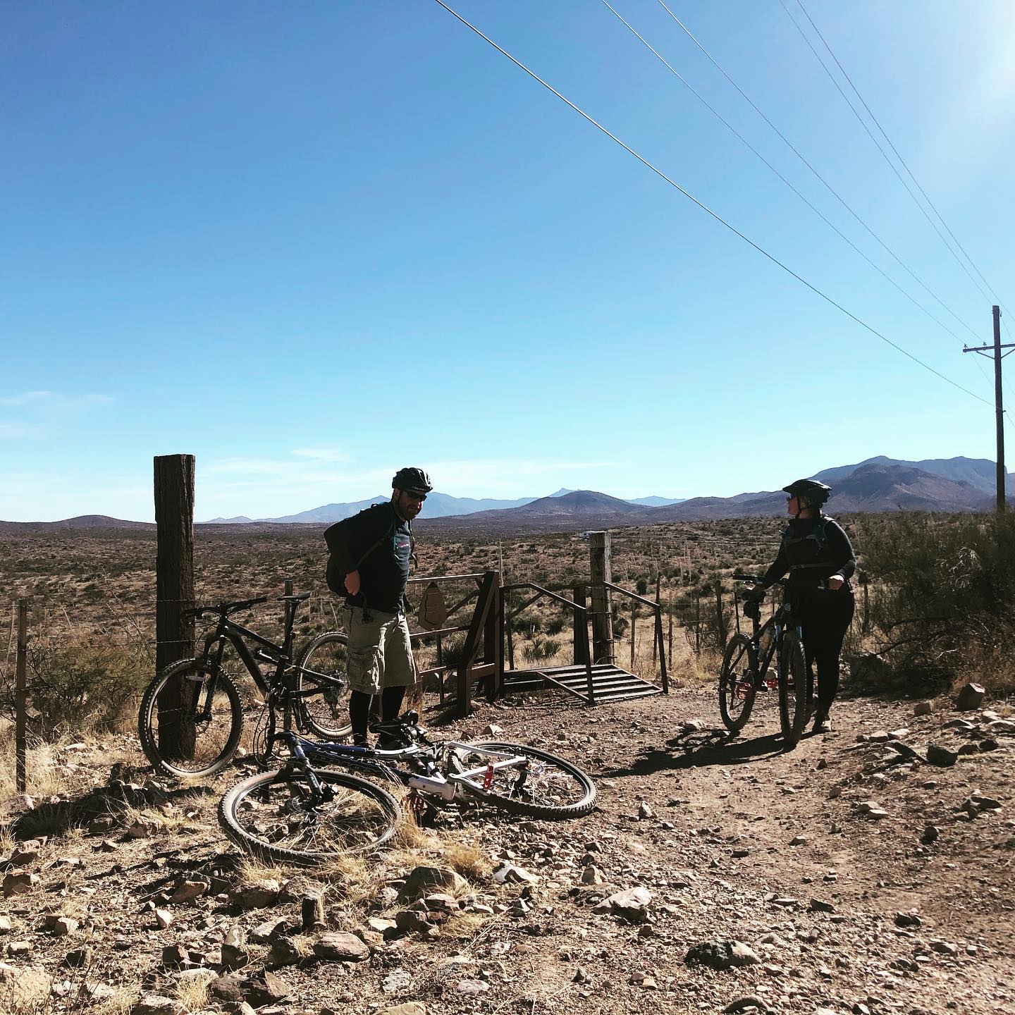 Mike, Josh, and I drove south from Phoenix for about 2 hours and ended up at the Gabe Zimmerman trailhead (named for a victim of the 2011 Tucson shooting that also injured Congresswoman Gabrielle Giffords). From there, we hopped on our bikes and started heading south. A few hours and 12.7 miles later, we reached the turnaround point at the spot where passage 6 turns into passage 7. The trail had good variety and pushed me as a not-particularly-skilled mountain biker. There were lots of loose rocks and a few rather steep sections. Our southbound leg was a bit more arduous than the return northbound leg, which was net downhill. I was relieved that the way back was much easier since I had my doubts about making it before nightfall when we stopped for lunch halfway.
